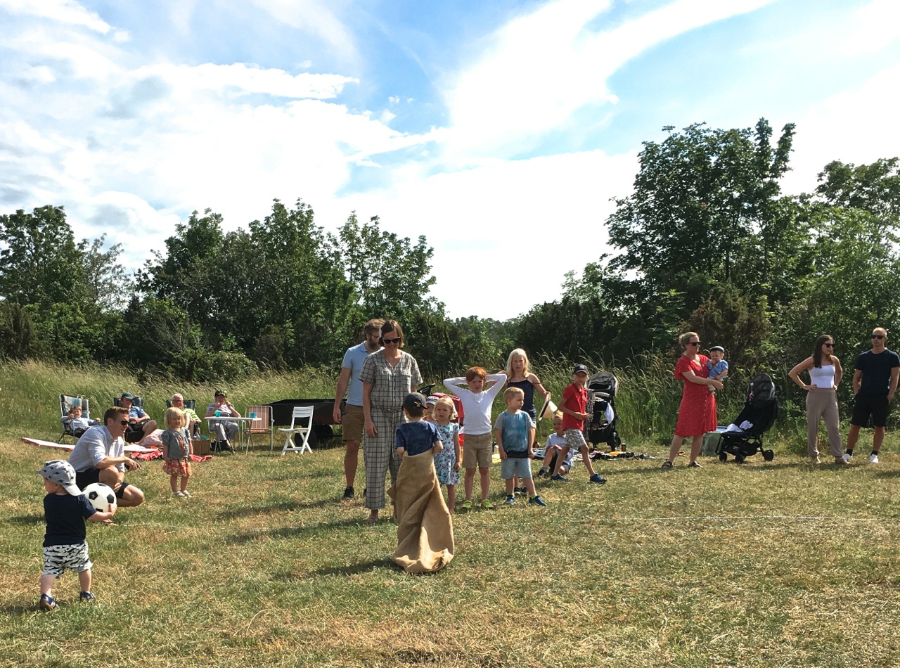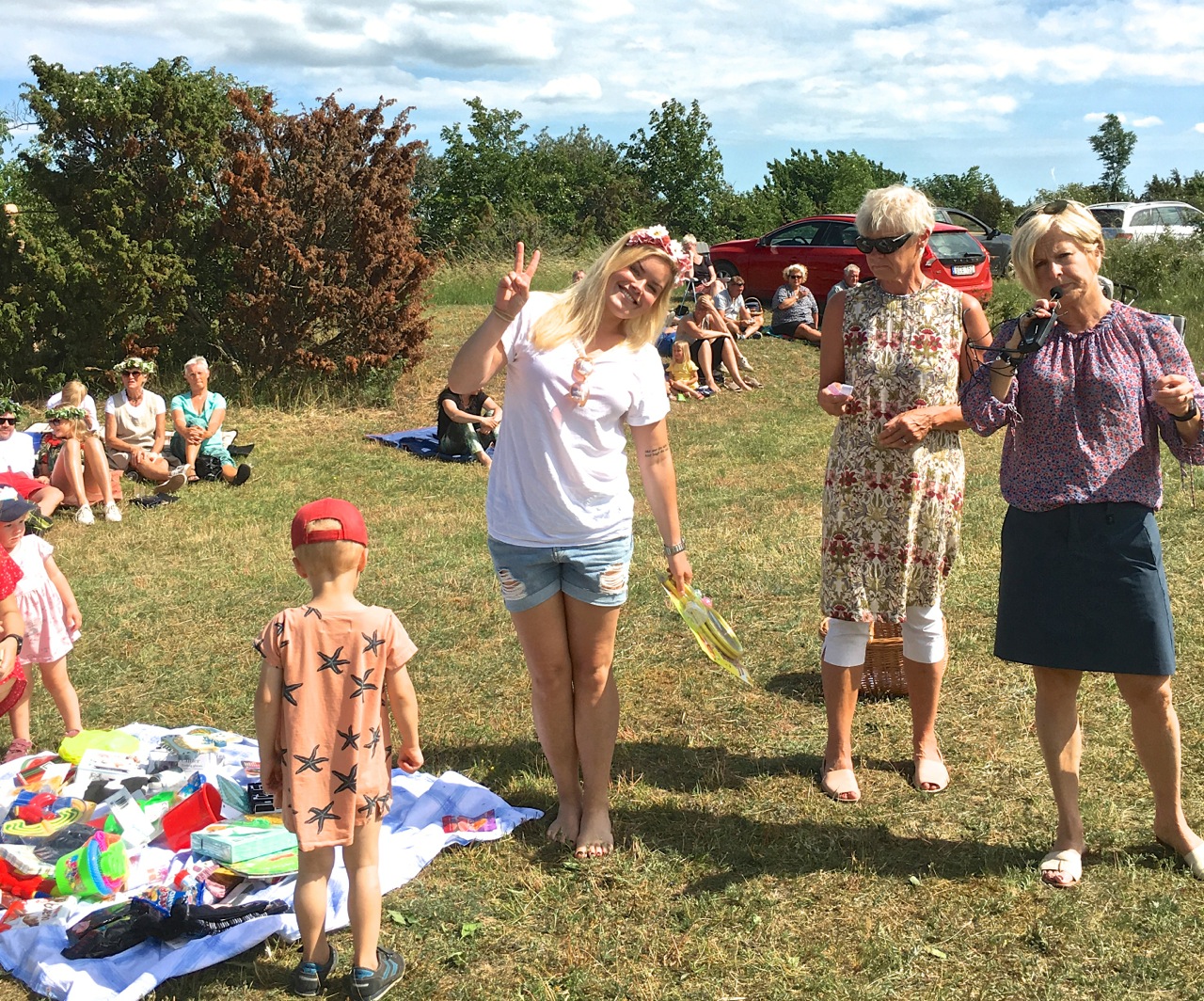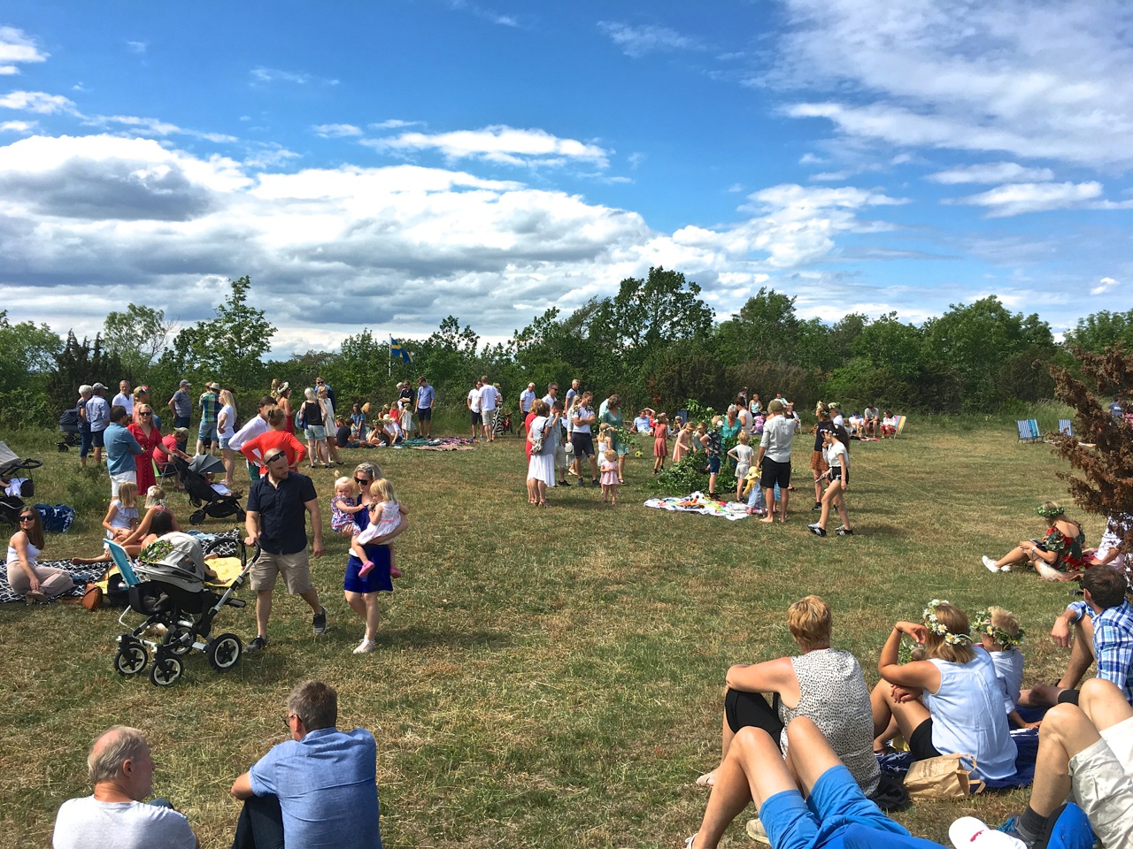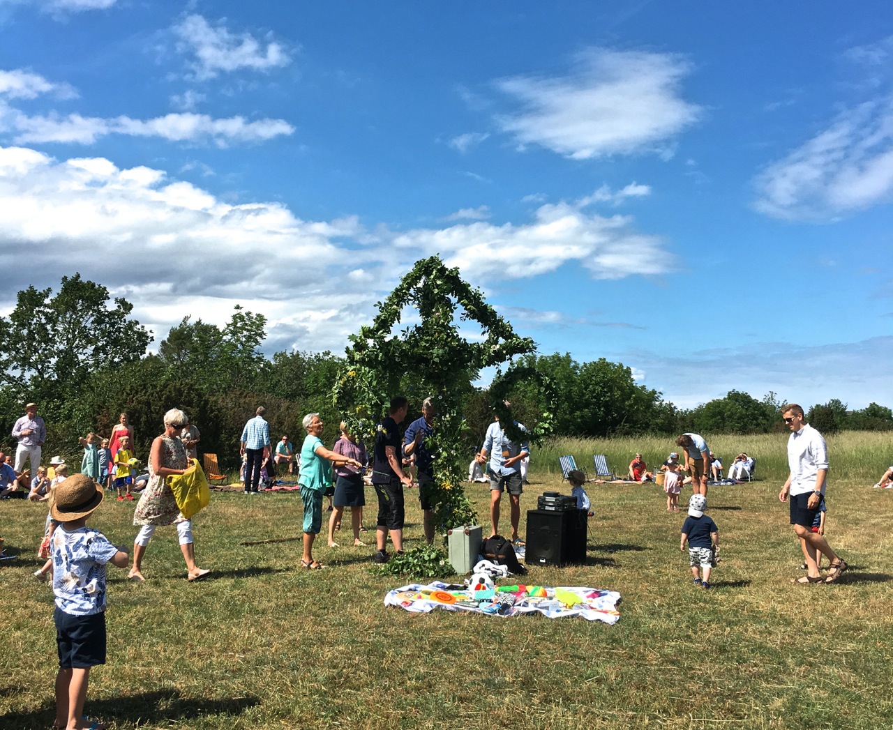 Traditionellt midsommarfirande på Midsommarängen blev det även detta år med stång som väntat sedan i fjor på att kläs igen med blommor och blad. Detta skedde som vanligt gemensamt och sedan var det dags för dans, lek och sång under ledning av Gunnel Henriksson, säcklöpning för dem som orkade lite till samt förstås lotteri med fina, skänkta vinster. Allt under en riktigt blå sommarhimmel med små vita molntussar.