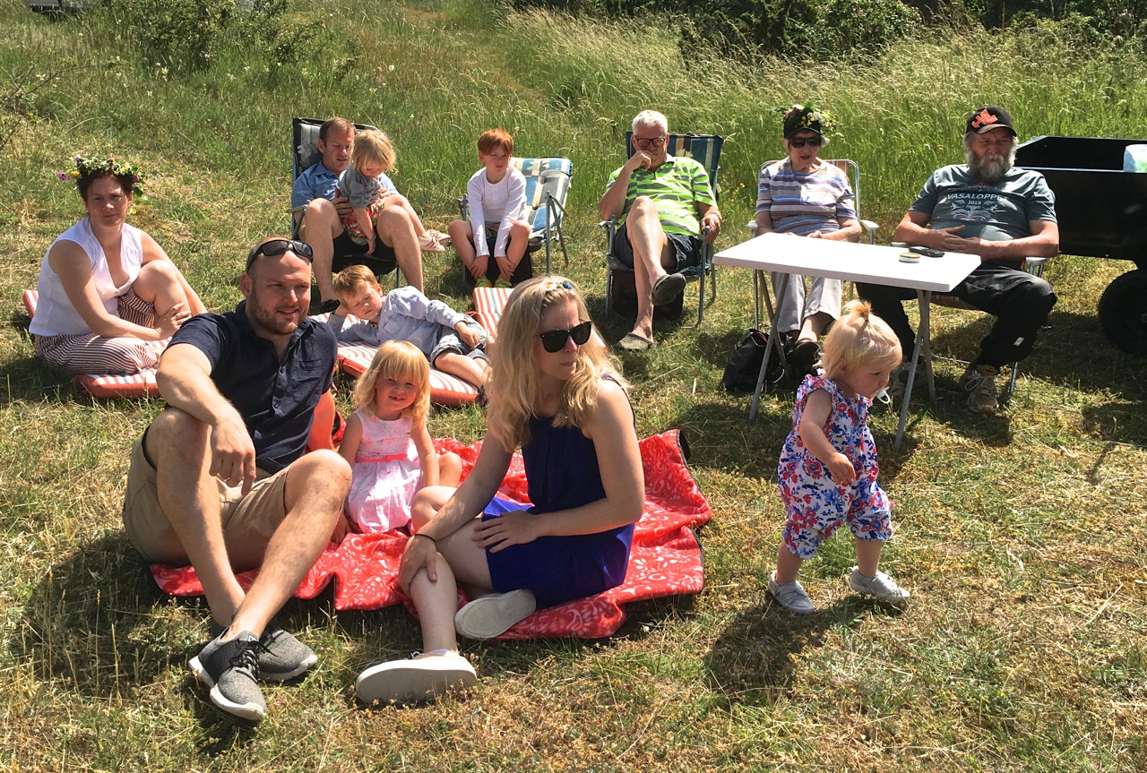 Klanen Roland samlad i ett hörn av Midsommarängen tillsammans med Maj-Britt och Ronny Andersson.