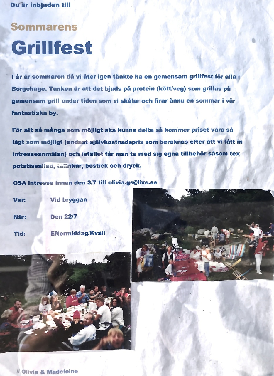 Det är hög tid att anmäla sig till sommarens stora gemensamma GRILLFEST i Borgehage. Vi hoppas att så många som möjligt anmäler sig så att det blir ett hejdundrande kalas att minnas.
