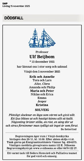 Idag, den 15 november 2025, var Ulf Beijboms dödsannons inne i Smålandsposten. Där framgår att han begravs om två veckor, lördagen den 29 november, i Växjö domkyrka.