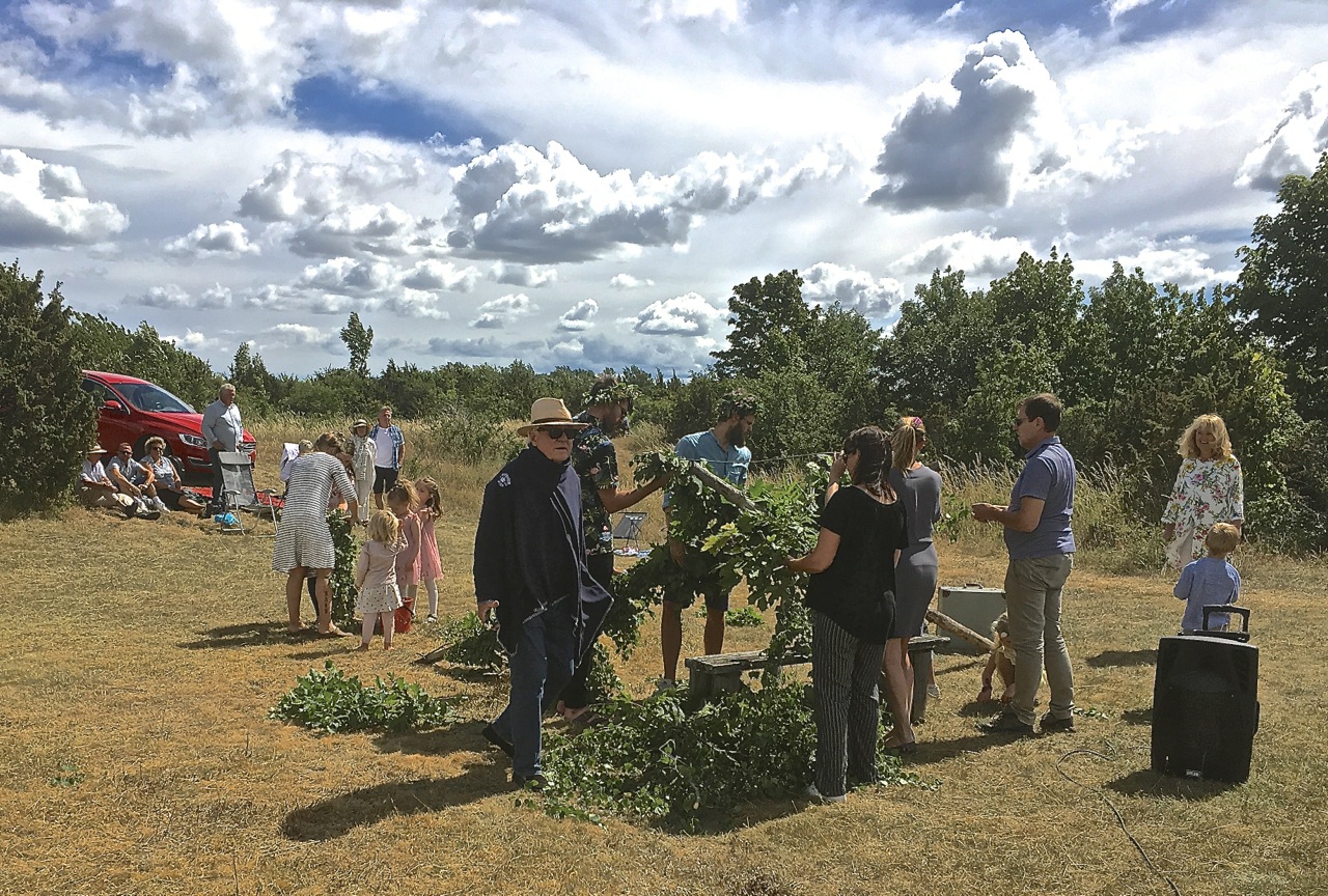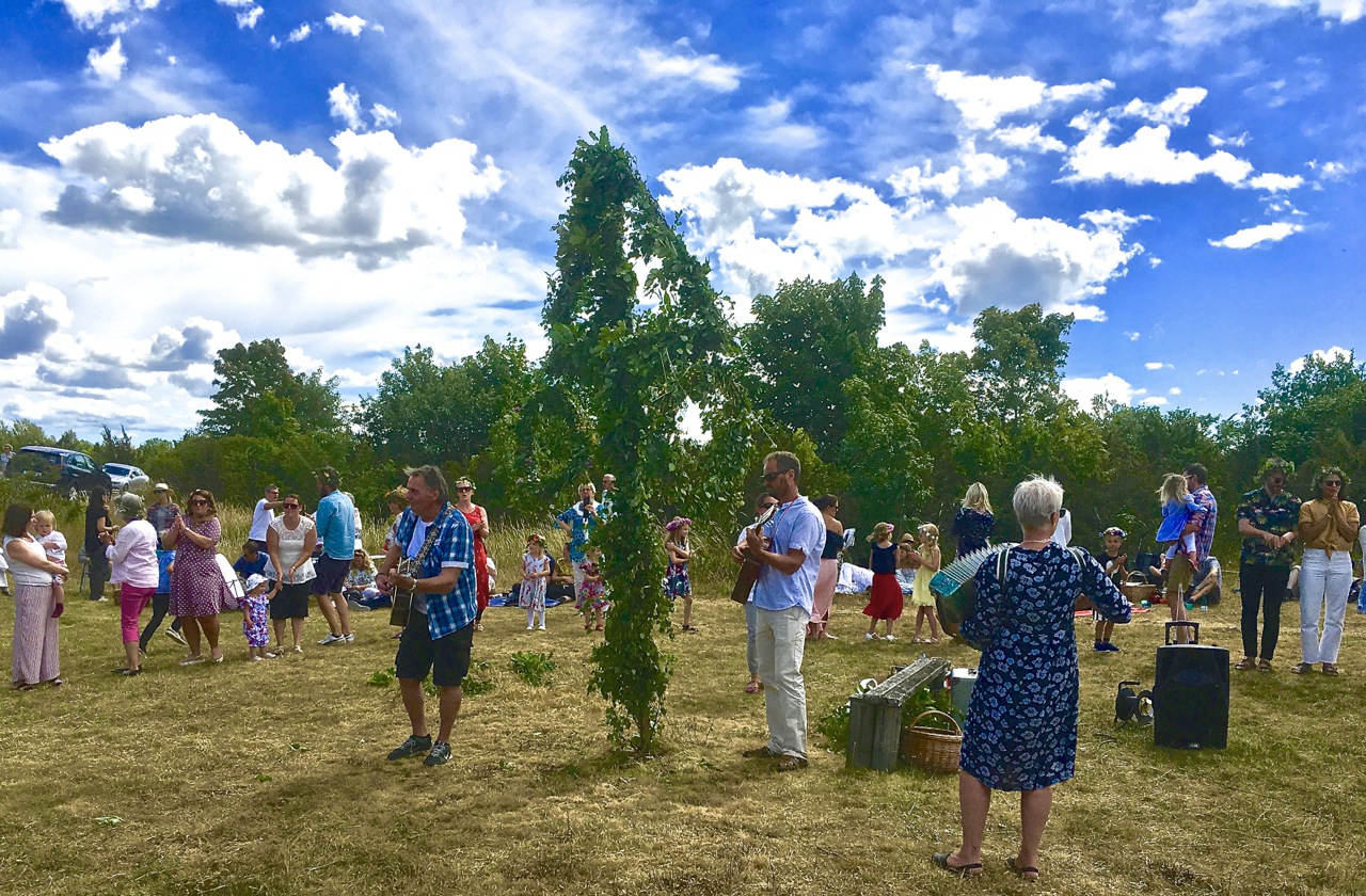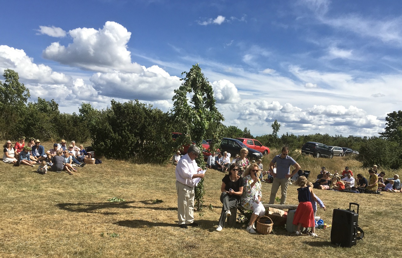 Årets midsommarfirande har börjat. På gulbränd äng men under lovande (?) mörka moln kläddes stången med friskt gröna löv. Alla bilder från midsommarfirandet är tagna av Ingrid Klefbäck. Tack för det.