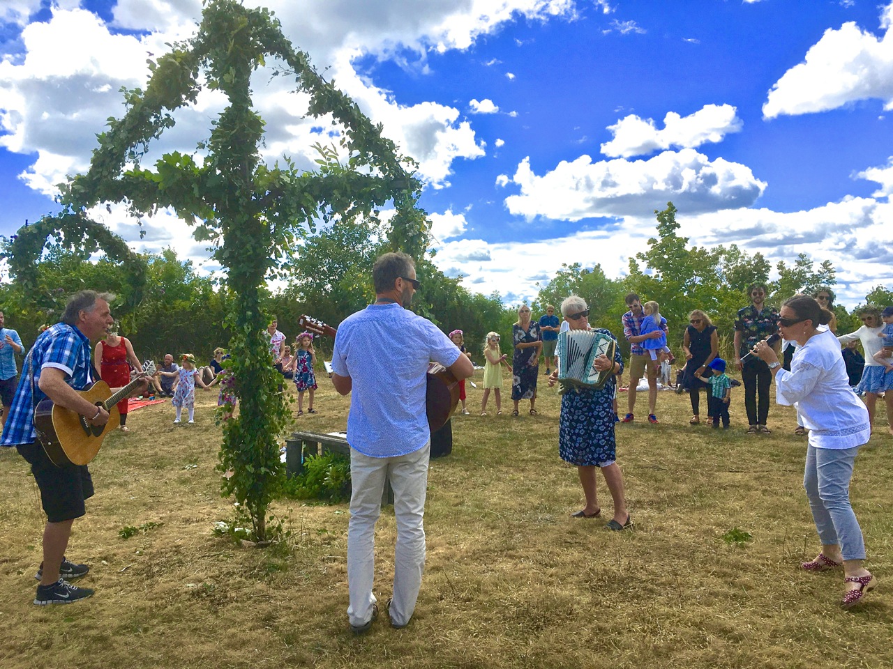 ”Så går vi runt en midsommarstång” under ledning av en musikalisk trio ledd av midsommarfirandets ansvariga Gunnel Henriksson och hennes dragspel.