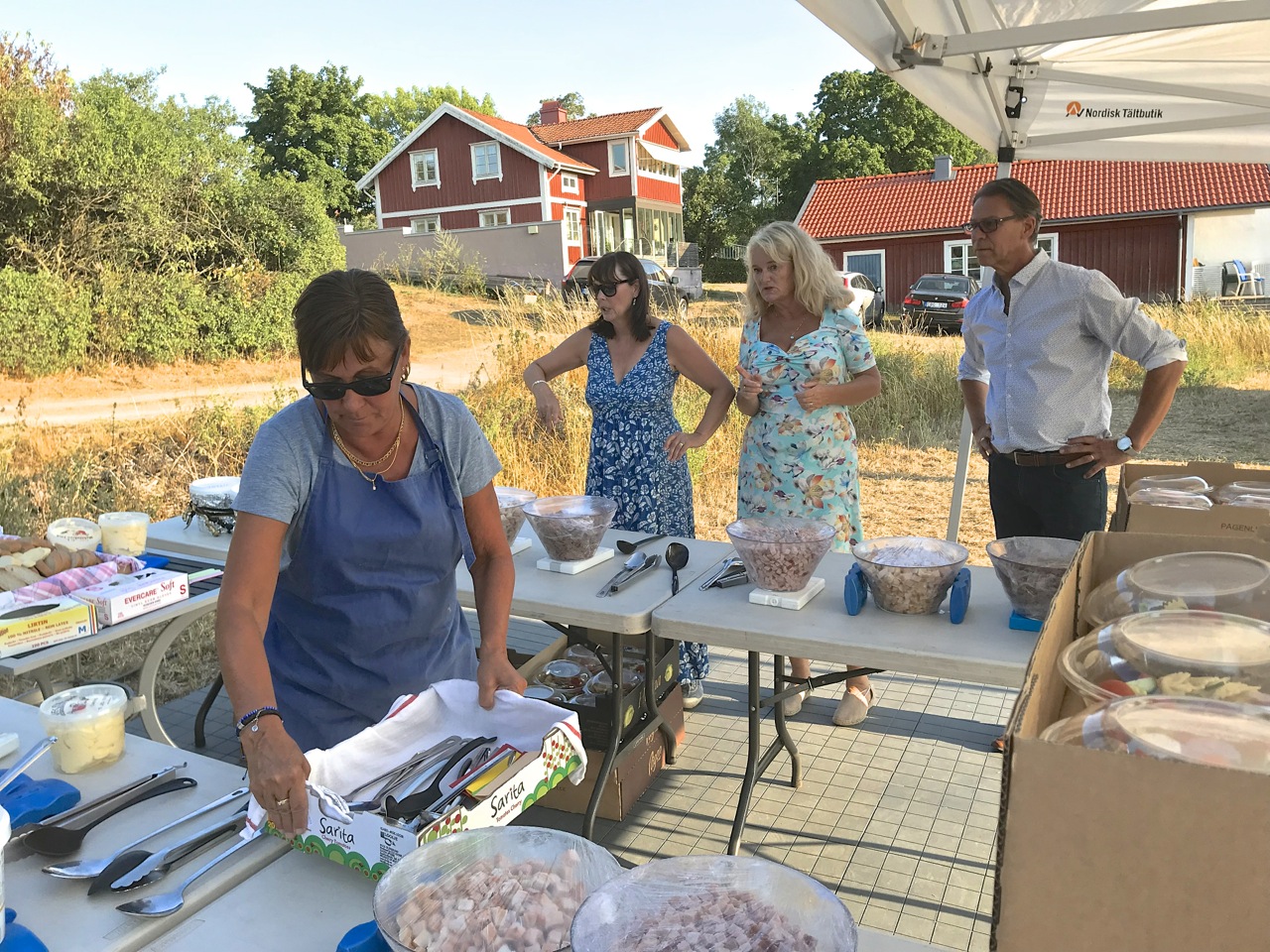 Festmåltiden dukas upp av Päivi Sahlén Grönberg medan Bibbi Portnoff Engstrand, Kicki och Roger Lundberg checkar av att allt kommit på plats.