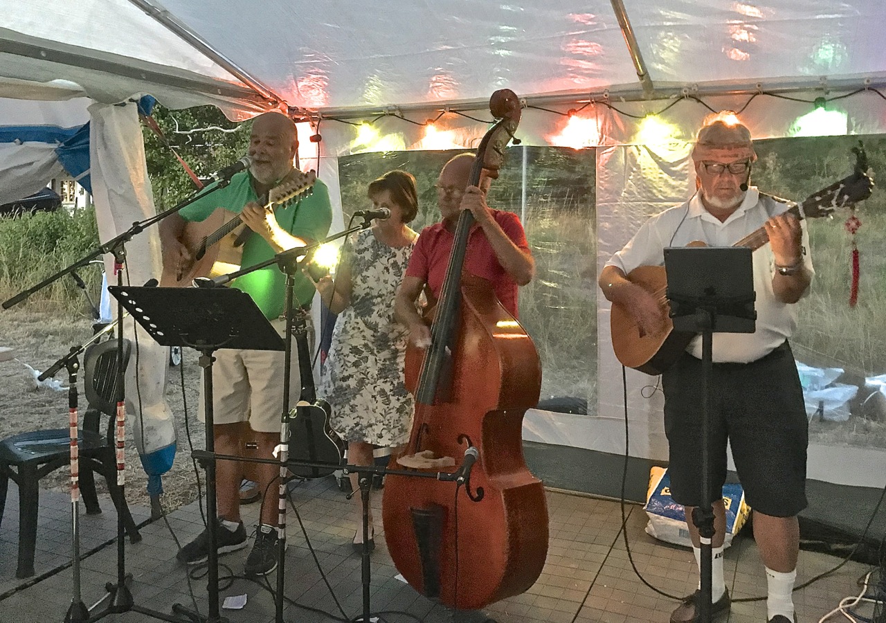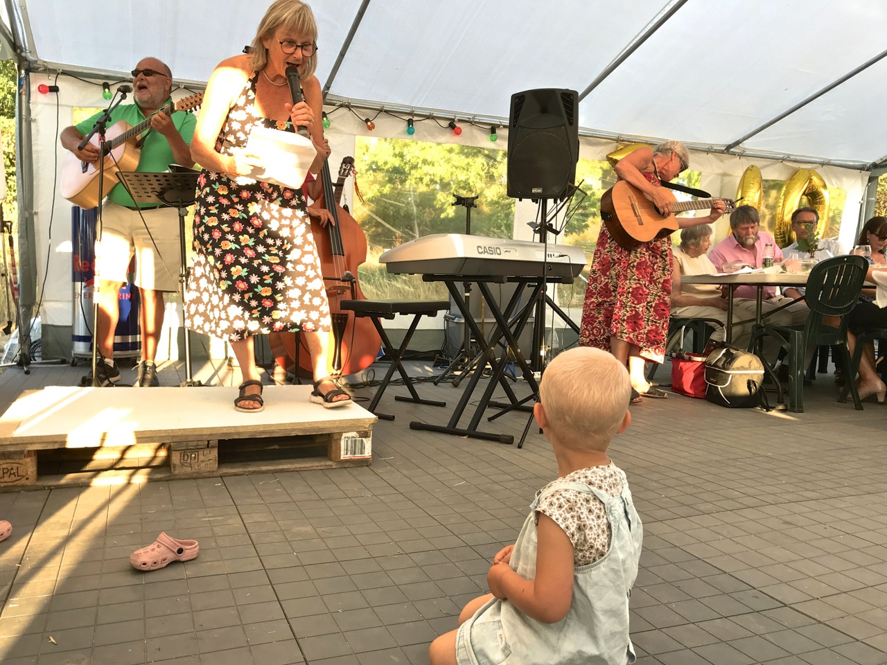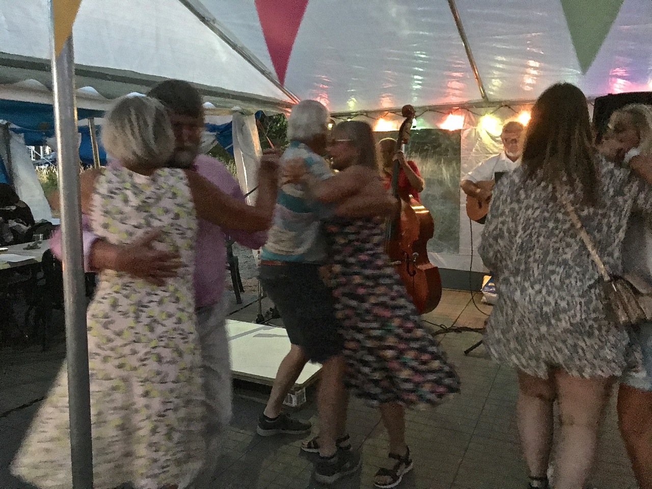 Nej, stämningen var hög och samvaron trivsam med god mat, allsång, musikunderhållning och danslockande spel av en glad trio. Och tillfälle för samtal grannar emellan som tidigare bara skymtats vid brevlådorna eller på badbryggan.