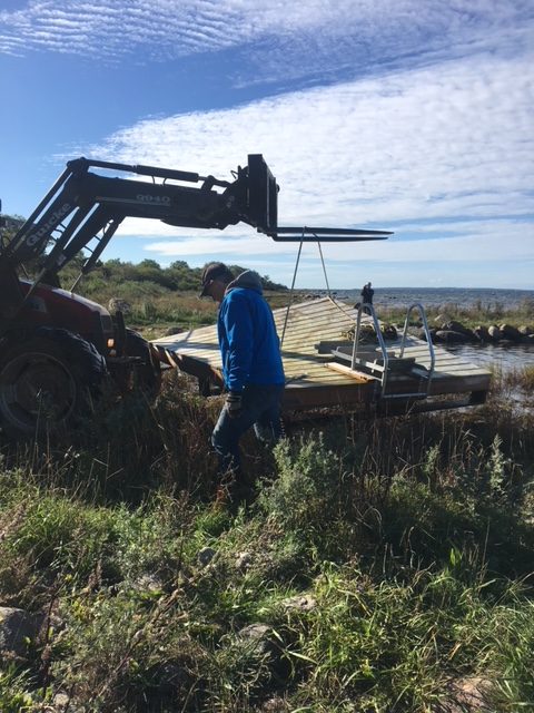Så är badsäsongen definitivt slut för i år och bryggan och flotten har hamnat i säkerhet på land för höststormarna. Tyvärr hade flotten hunnit slita sig även i år och fått sig en del törnar. Så inför nästa säsong måste den repareras. Dessutom måste bryggan få en ny stege!