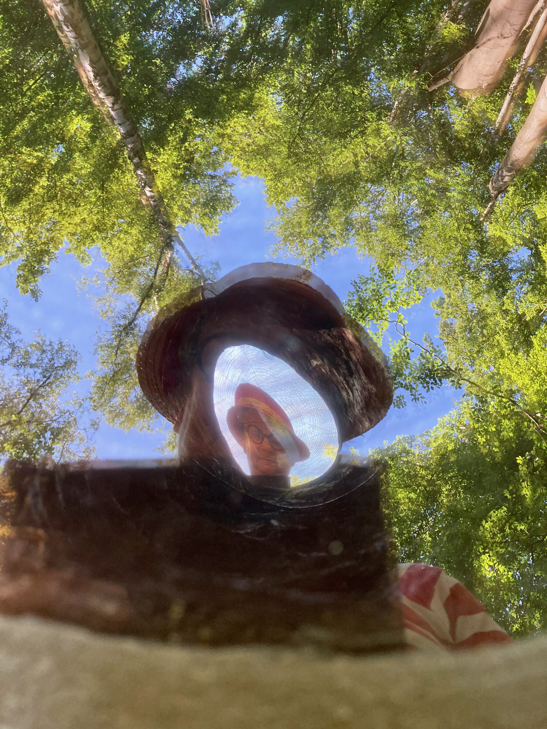 Överst syns årsringar på en glasskiva och allra längst ner ser betraktare – sig själv. Som en del av verket och naturen runt omkring.