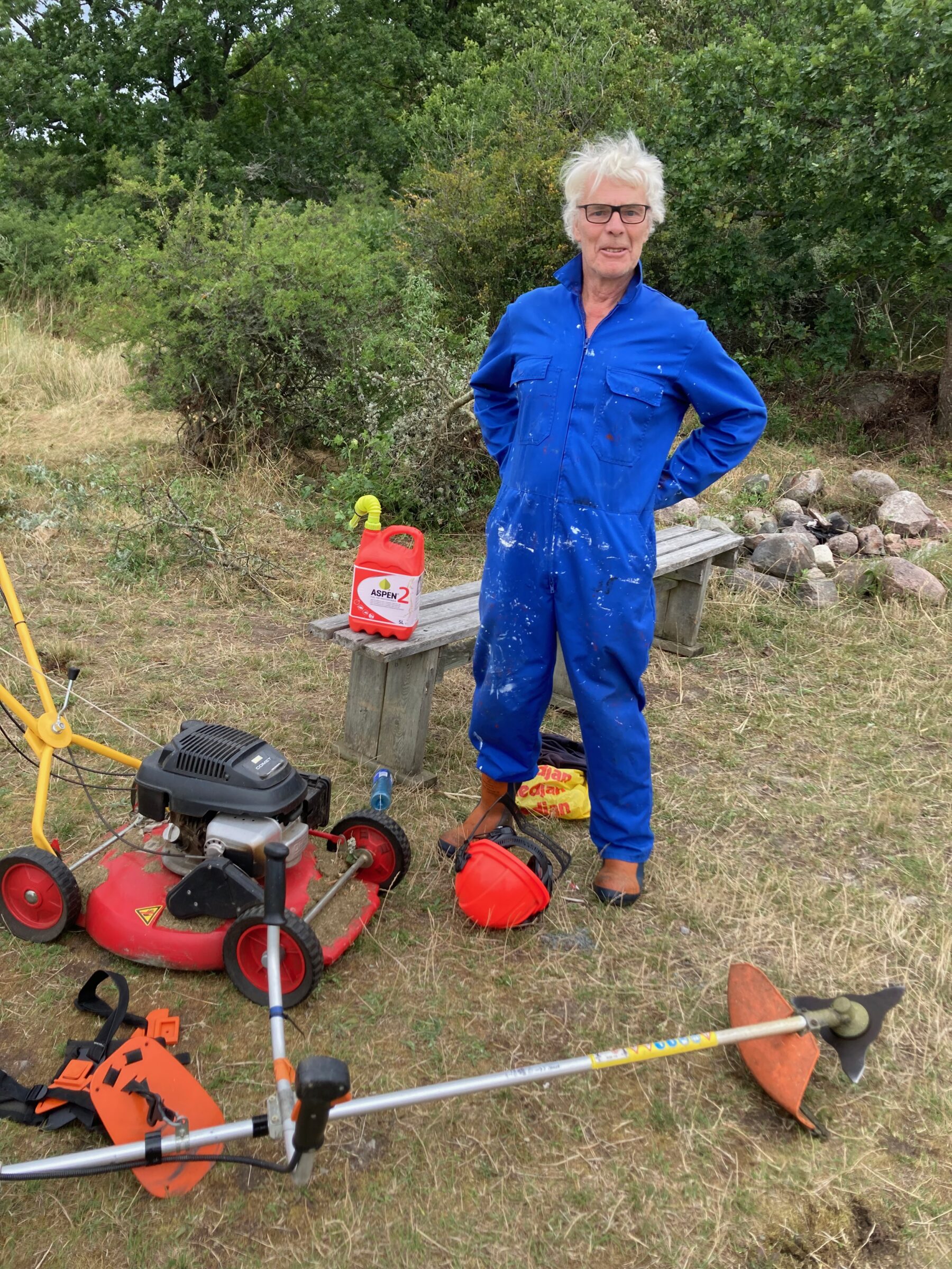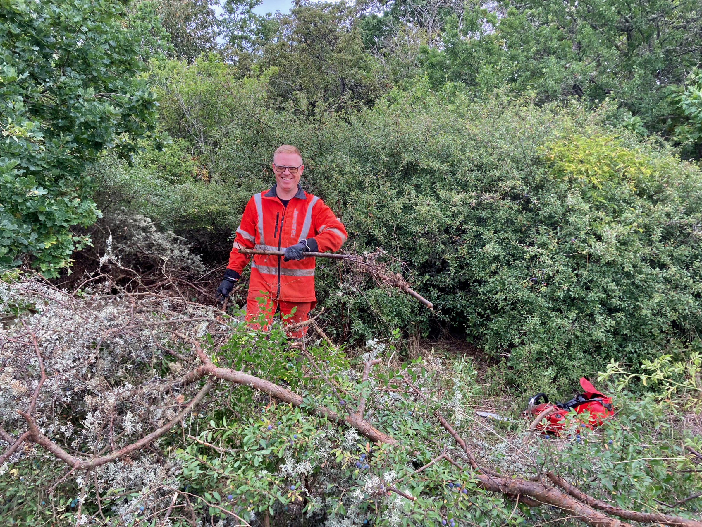Robert Holm tog en paus i arbetet med röjsågen innan han satte igång igen.