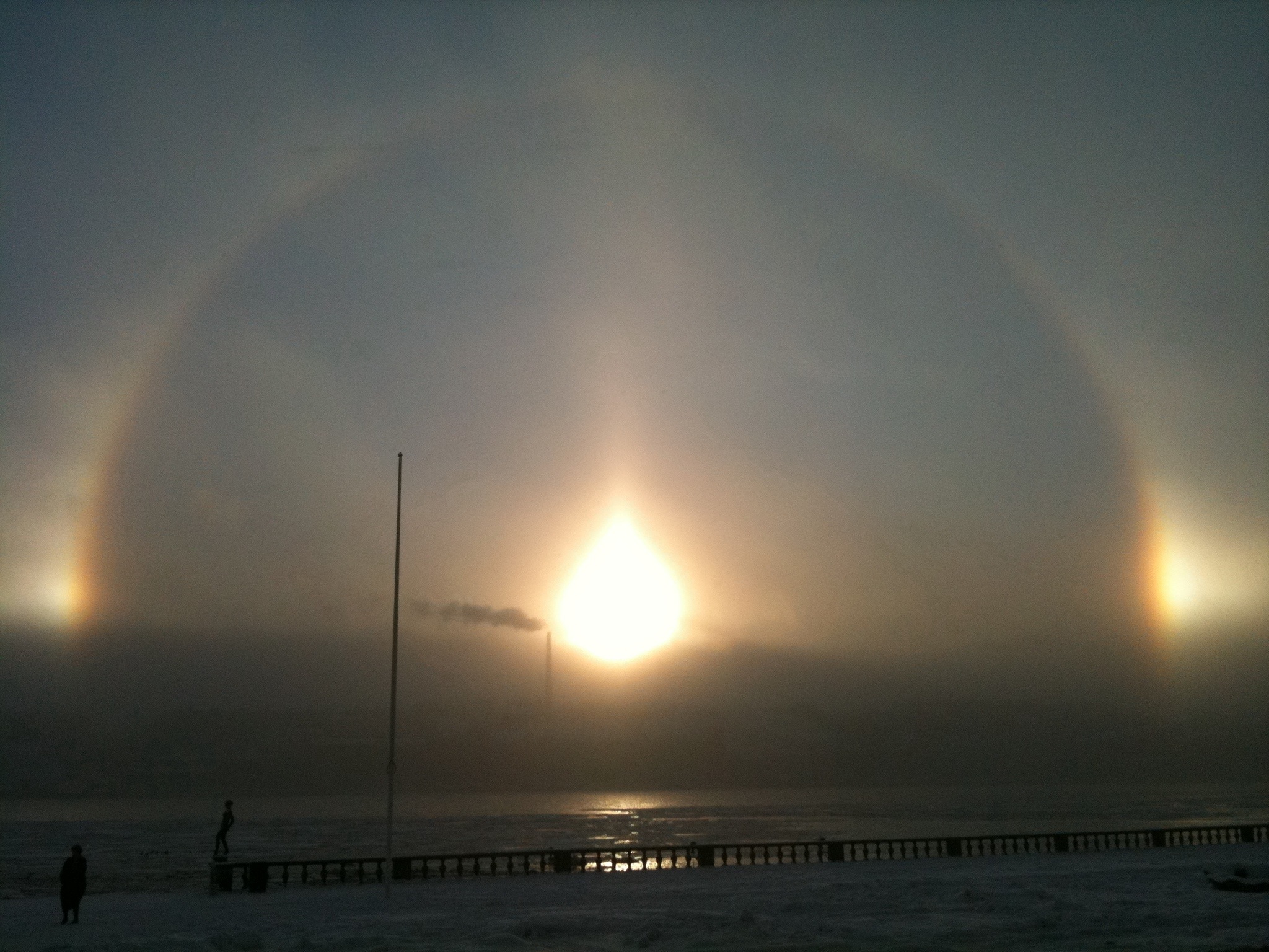 Med önskan om en God Jul och ett Gott Nytt År visar jag denna fantastiska syn över Riddarfjärden i Stockholm. En halo ser man sällan, men i mitten av december fick vi denna sällsynta vy från Stockholms stadshus. Luften är full av iskristaller, vilka bildas i sträng kyla över öppet vatten och det är denna situation som ger ett sånt ljusfenomen.