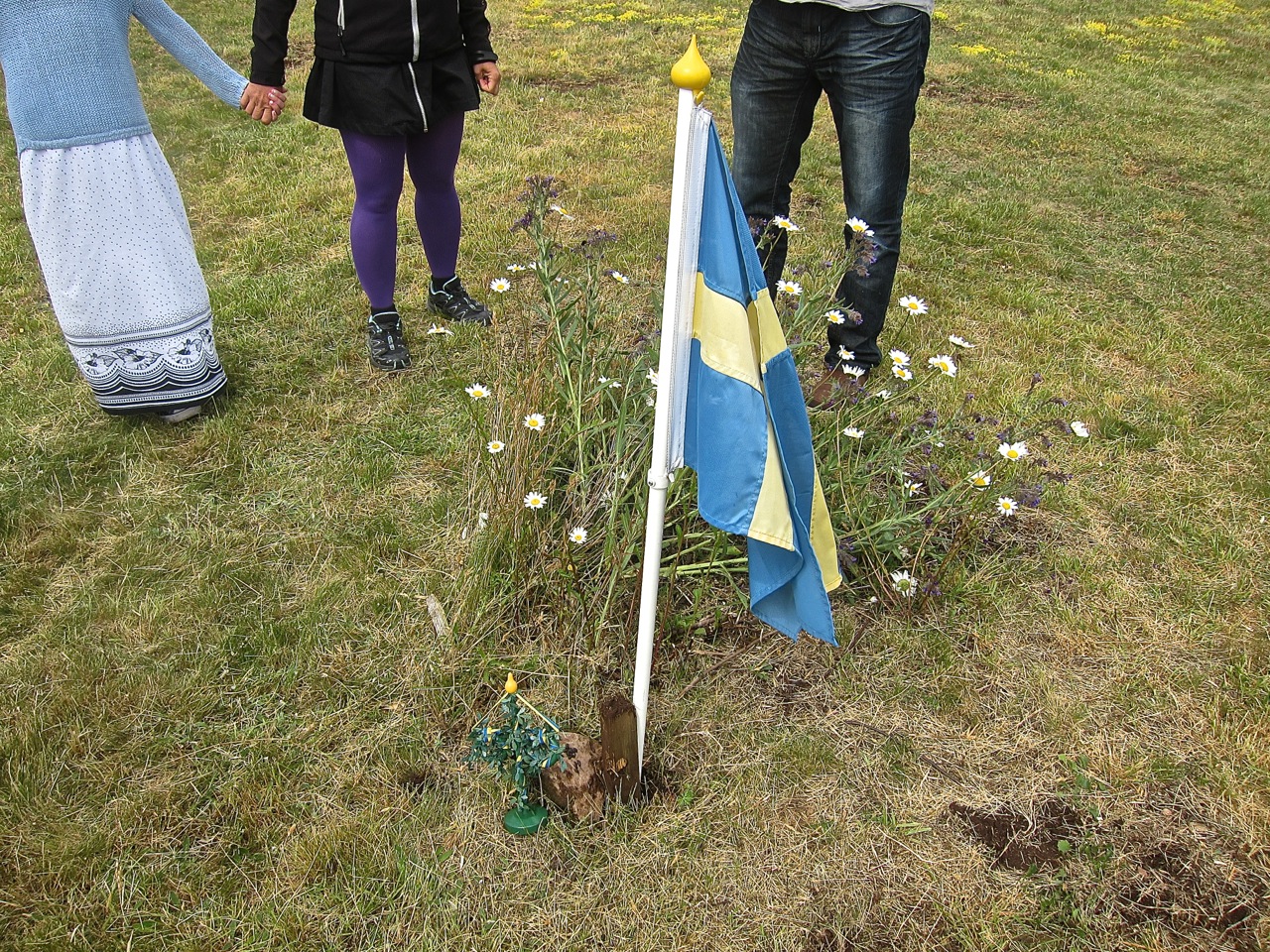 Förra året såg det ut så här på midsommarafton. Vi fick nöja oss med en liten, liten stång och en flagga. I år ska stången kläs – oavsett väder, lovar Byalagets styrelse. Vi träffas kl 13.30. Ta gärna med lövruskor och blommor så hjälps vi åt att dekorera och resa stången.