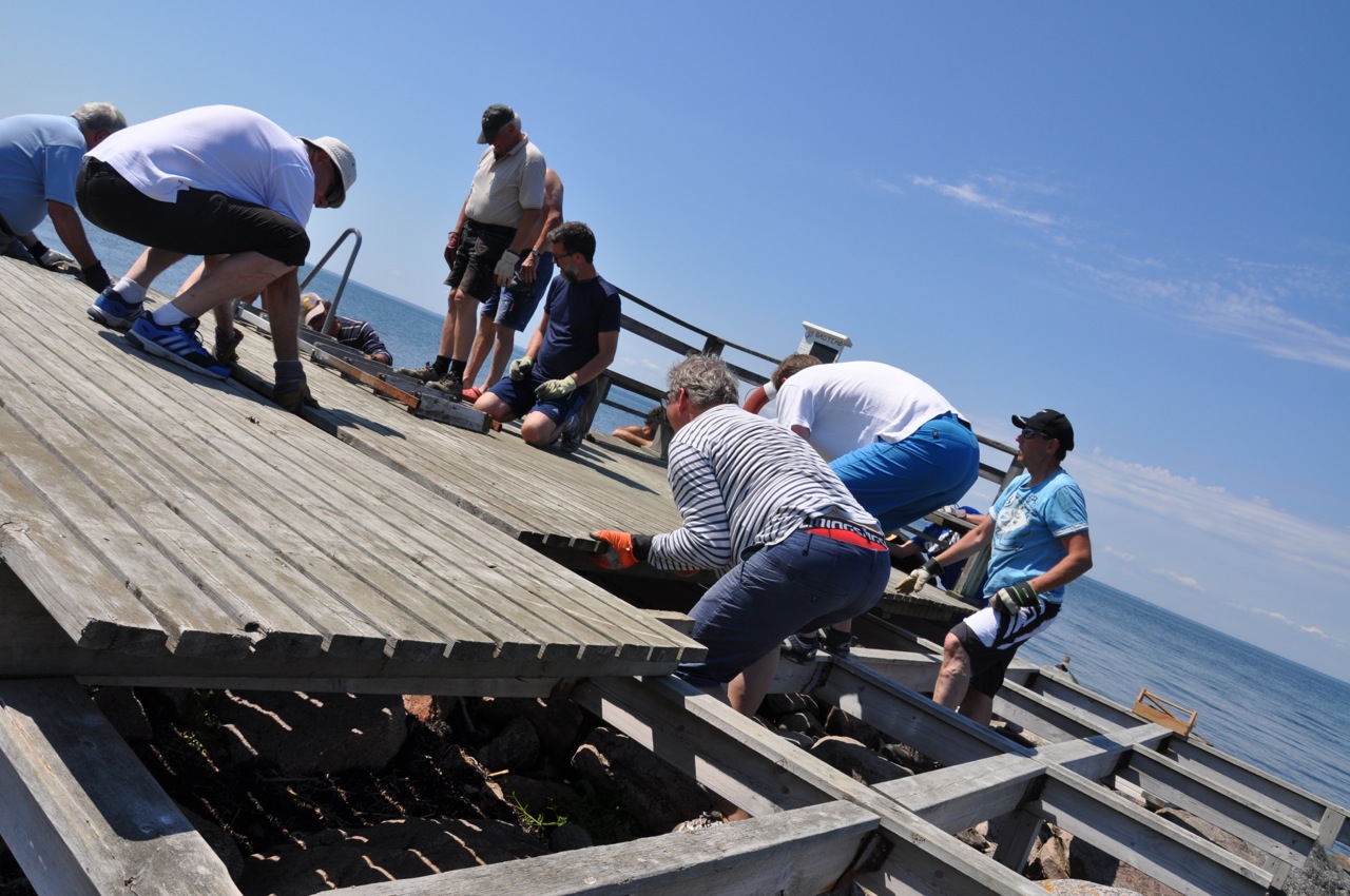 Ivern att få bryggan på plats denna osedvanligt heta midsommar var stor. Ett 30-tal bybor kom och med Ronnys traktor som hjälp kom den på plats på rekordtid! Tack alla som hjälpte till och la i bryggan och röjde på stranden.